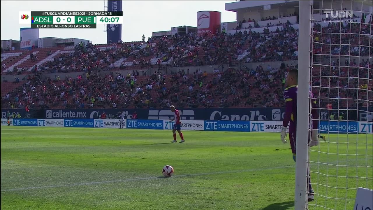 ¡Gol! Atlético San Luis 0| Puebla 1. Santiago Ormeño (Puebla) Disparo con la derecha desde el centro del área disparo rastrero| junto al palo izquierdo.