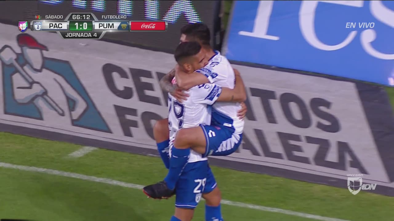 Tras varios intentos, finalmente la dupla del Pachuca se manifestó en el marcador, luego de un servicio al área de Sosa que Jara remató de cabeza al poste cercano de Saldívar.