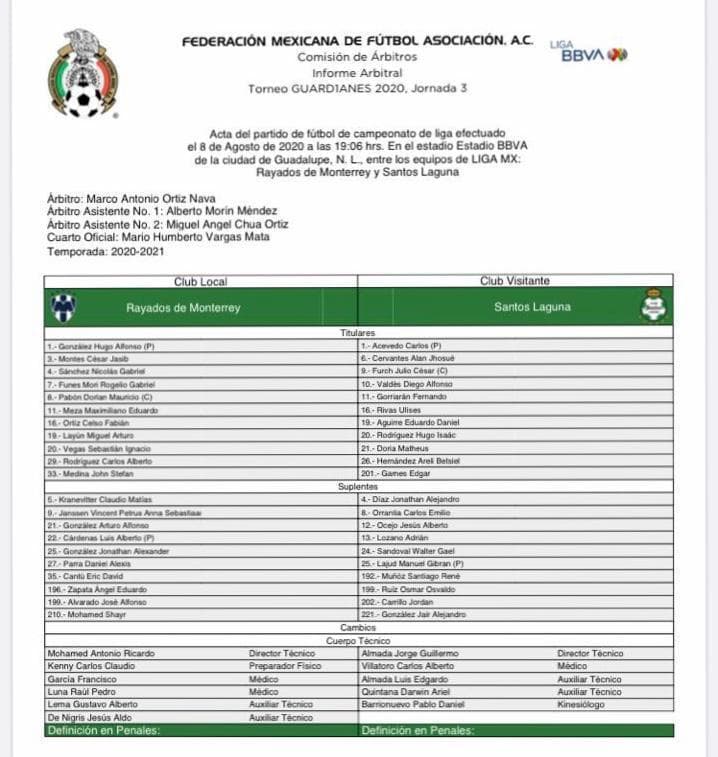 En la cédula arbitral del partido incluso no aparece el nombre de algún preparador físico sustituto y del lado de Santos Laguna carece de esa figura en las anotaciones del encuentro de la Fecha 3.