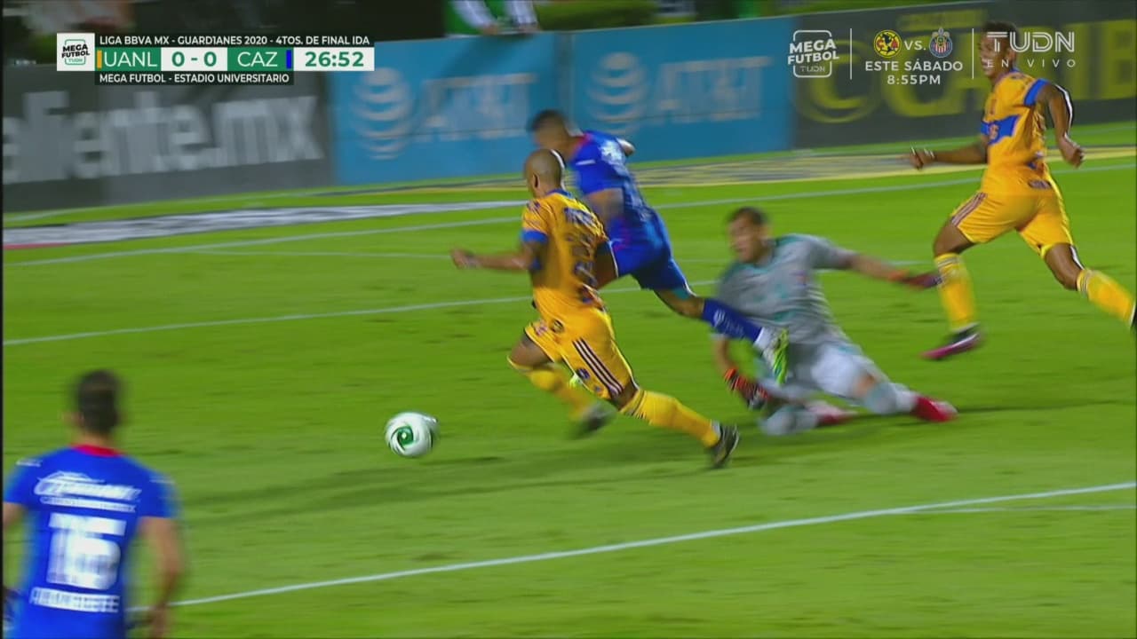 Pineda entró al área, intentó eludir al arquero de Tigres, quien lo rozó, pero no el VAR no marcó al 26’.