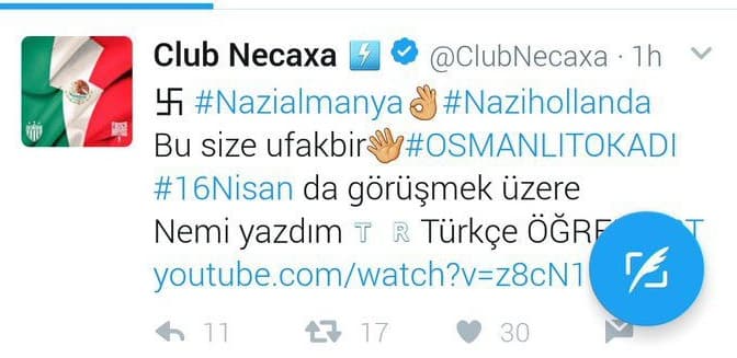 #Nazialmanya y #Nazihollanda junto a un video, fue la publicación colocada por el grupo de delincuentes informáticos en la cuenta de Twitter @ClubNecaxa.