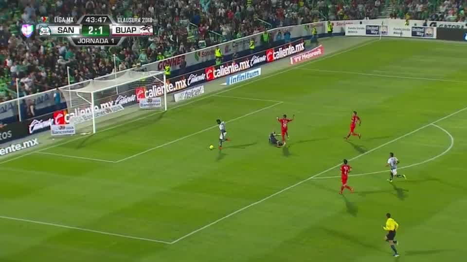 Buen pase filtrado para que el atacante lagunero eluda al portero de los visitantes y luego empujara la pelota para hacer el 3-1.