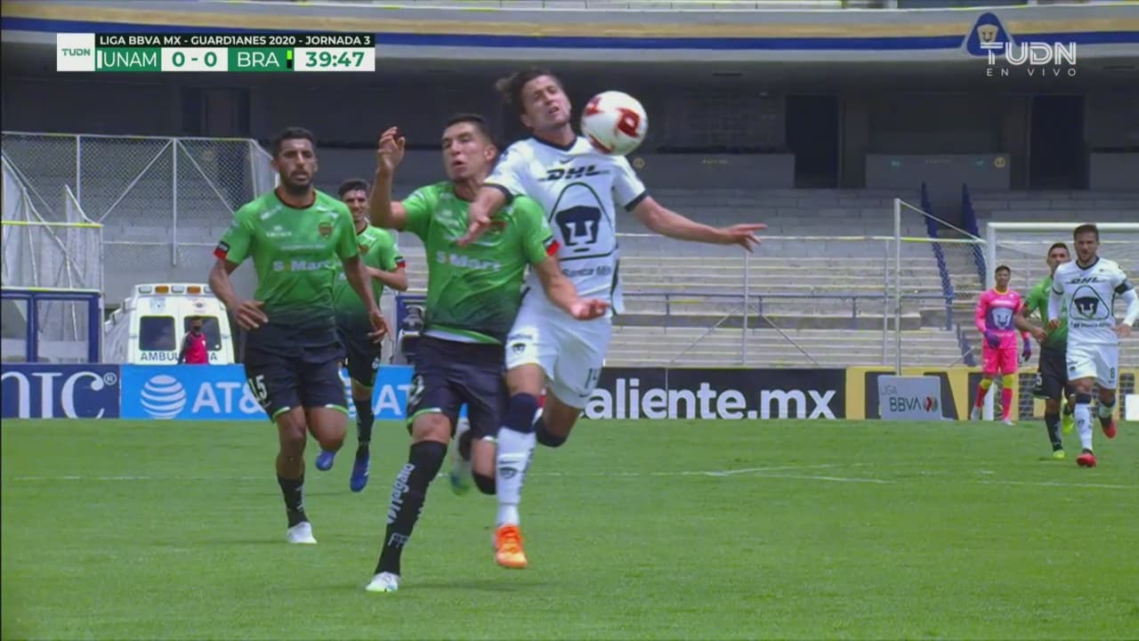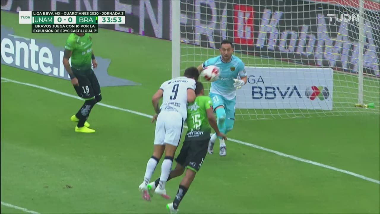 Accidentado primer tiempo para Bravos de Juárez, luego que recibieron la tarjeta roja para Erick Castillo por una falta, eso cedió un poco el dominio terriotorial a Pumas, que empezó a atacar y estuvo cerca de colocar la primera de gol, sin embargo, Carlos González no impactó certero.