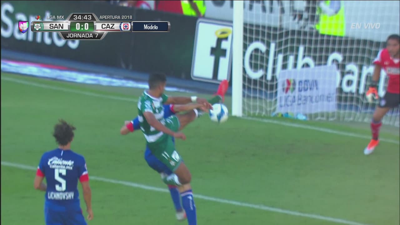 Centro de Brian Lozano desde el sector derecho y el atacante mexicano tuvo la primera para Santos.