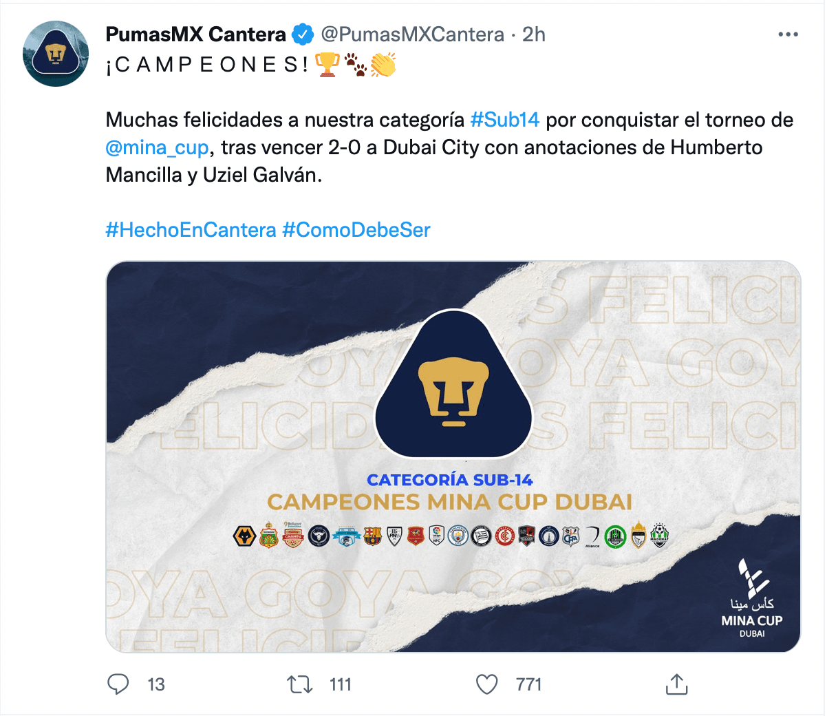 La división juvenil de los universitarios alzó el trofe de la Mina Cup Dubai, certamen celebrado en los Emiratos Árabes Unidos, donde vencieron 2-0 al cuadro de Dubai City en la Final.