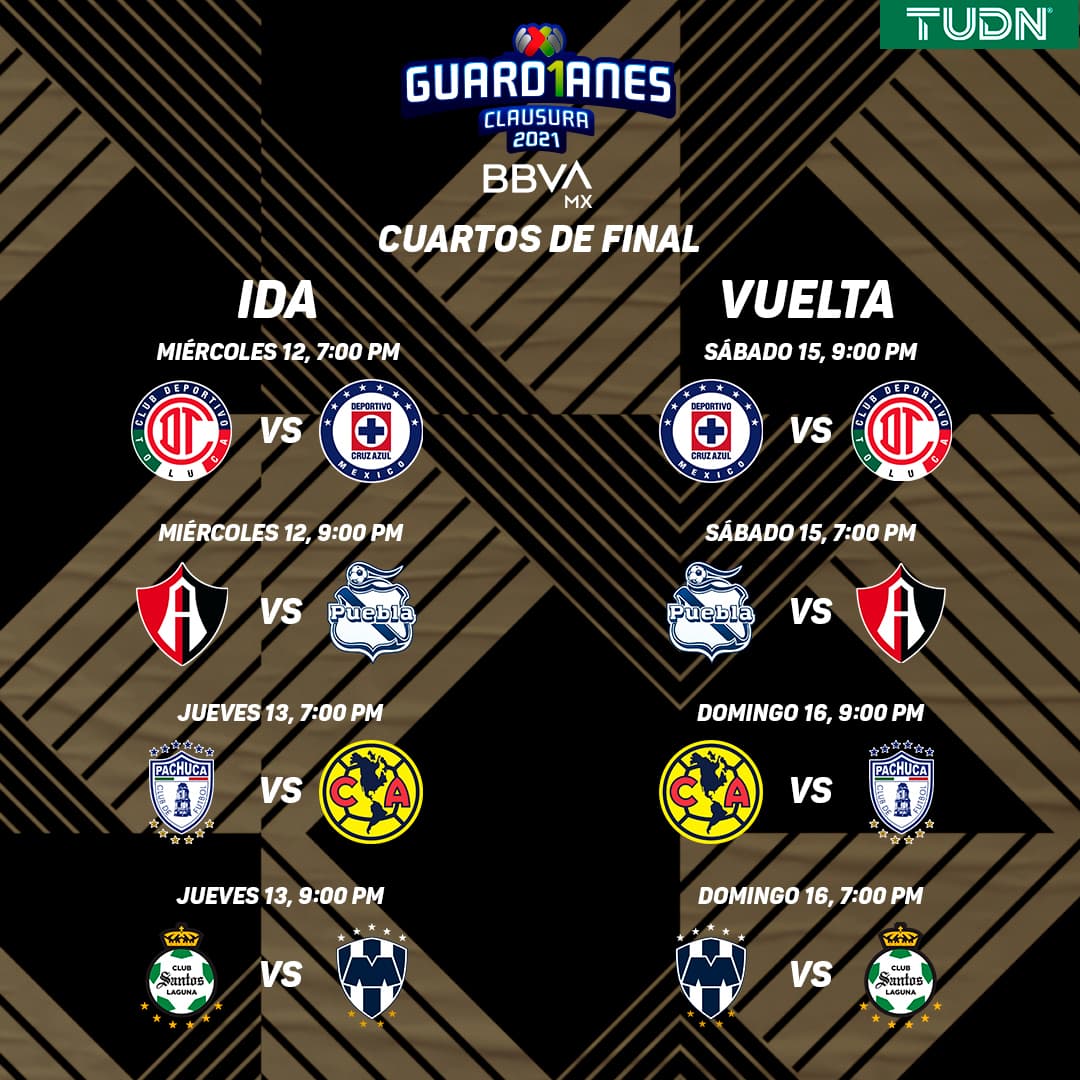 Llegó la fiesta grande del del futbol mexicano y con ello los cruces de los cuartos de final rumbo al título de la Liga BBVA MX. Los ocho mejores equipos del torneo: Cruz Azul, América, Puebla, Monterrey, Santos, Pachuca, Atlas y Toluca buscarán el campeonato.
