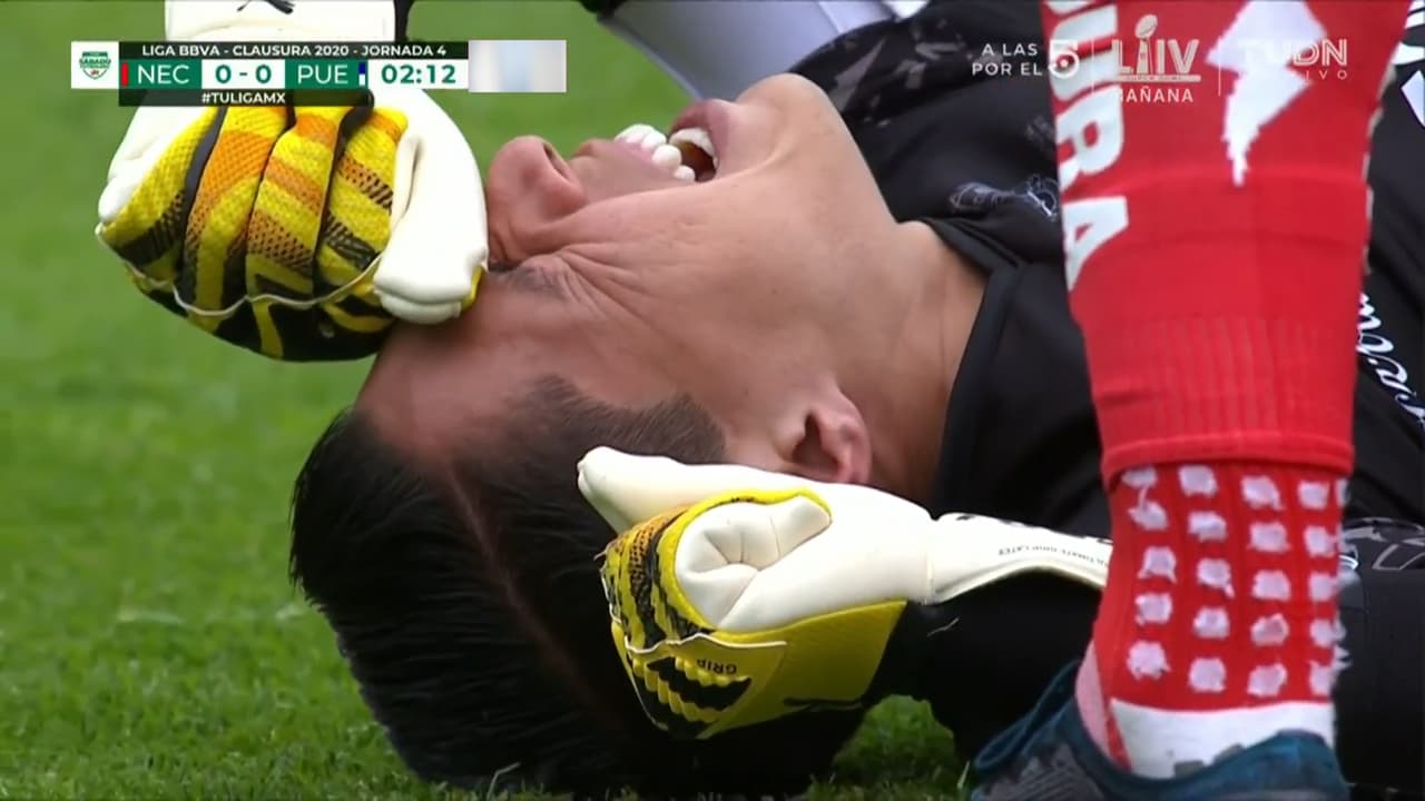 El arquero del Necaxa se lastima el tobillo derecho al caer mal en el área durante un tiro de esquina.