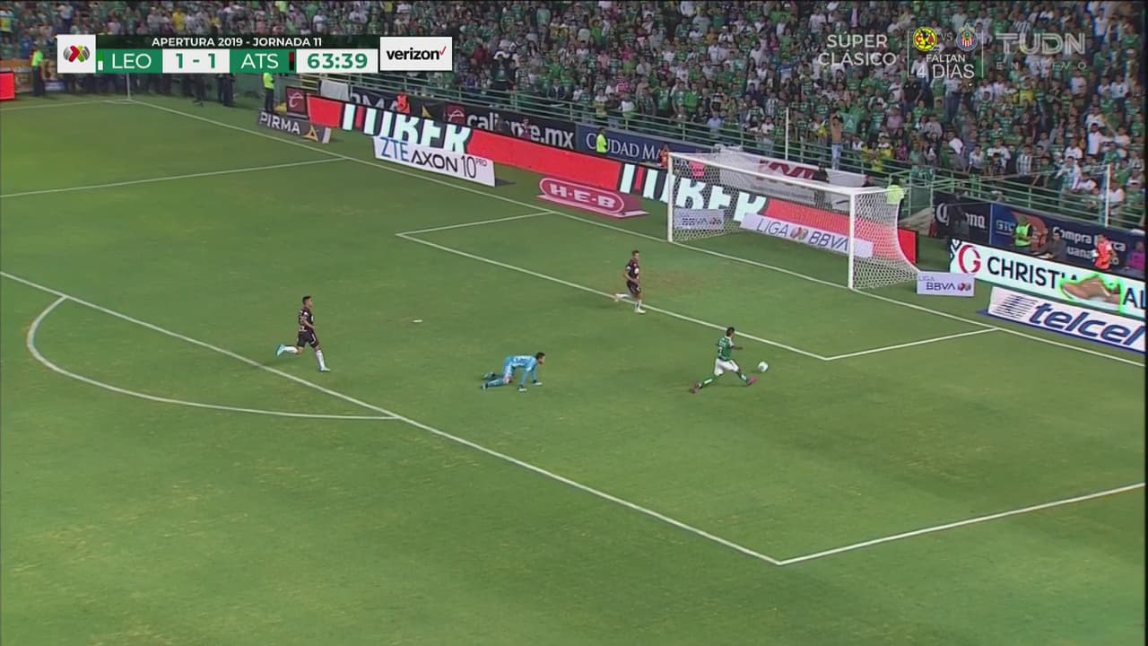 León perdona al Atlas luego de un pase al vacío en el que Sosa gana en velocidad y bota el balón por un lado de la portería.