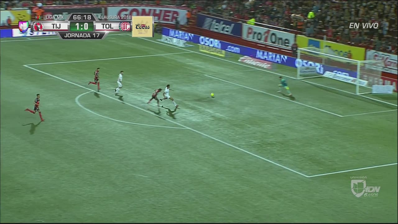 Gran pase para Bolaños, que en mano a mano no pudo darle dirección de arco y el balón se fue por un costado del arco del Toluca.