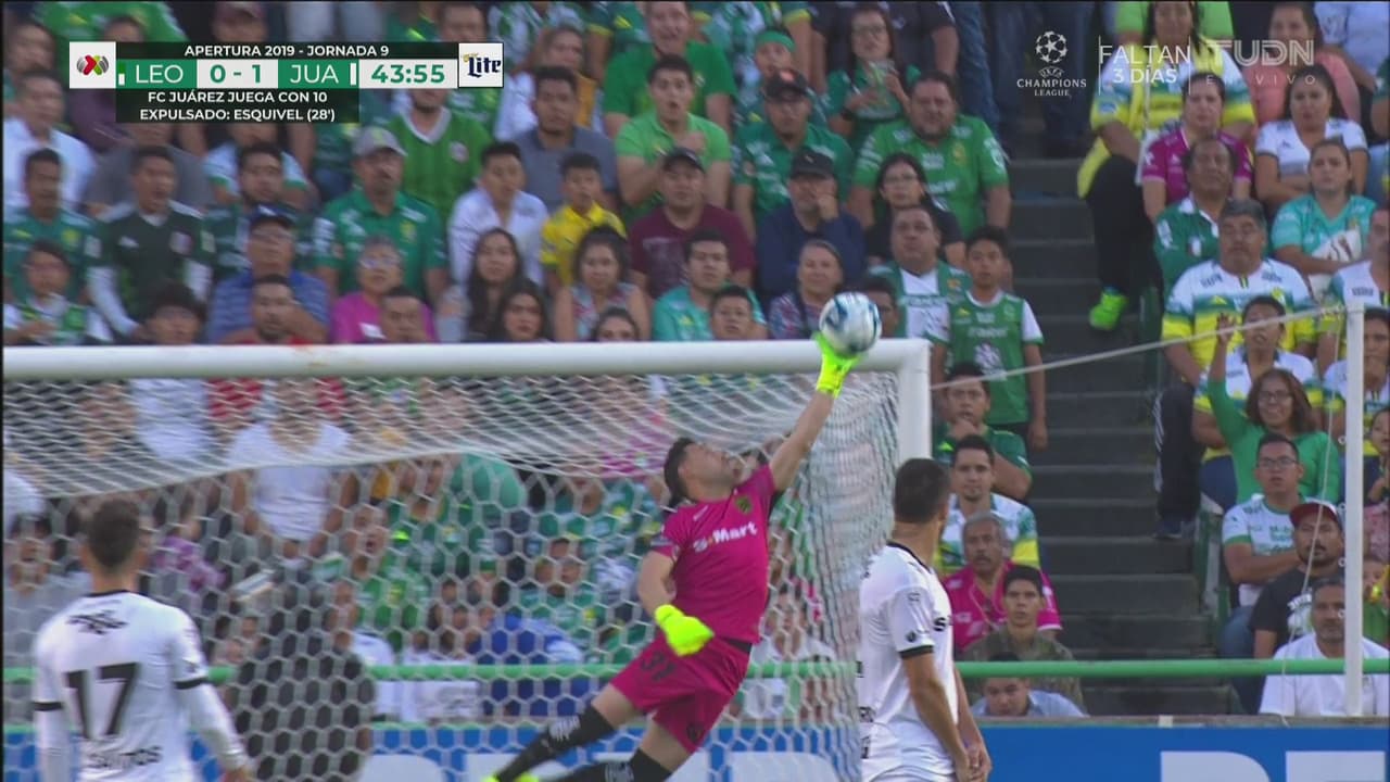 El portero de FC Juárez saca de forma impresionante, a tiro de esquina, el cañonazo de Pedro Aquino.