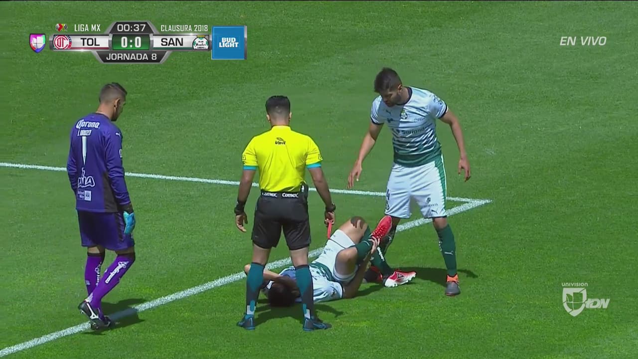El defensor del Santos sufrió un duro golpe sobre su tobillo que amenazó con sacarlo del partido por lesión.