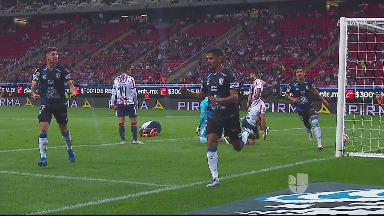 La defensa de Chivas no logró despejar de buena forma, la pelota quedó muerta en el área y Jara la punteó para abrir el marcador.