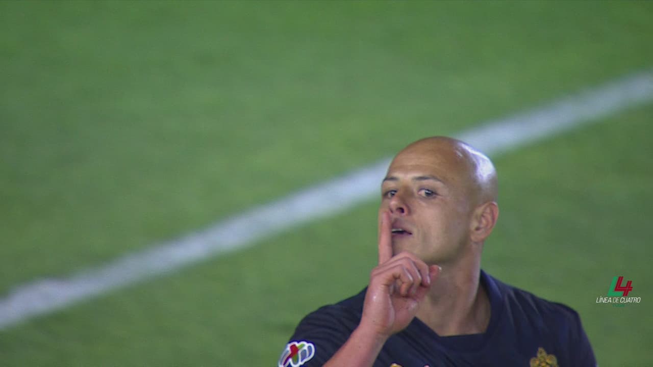 El 'Chicharito' se lleva el dedo índice a la boca, como señal de guardar silencio, tras anotar el gol con el que acercó a Chivas.