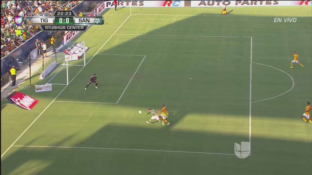 El atacante de Santos Jonathan Rodríguez tuvo un balón con ventaja en el área, pero no cruzó lo suficiente su disparo y lo regaló al portero de Tigres.