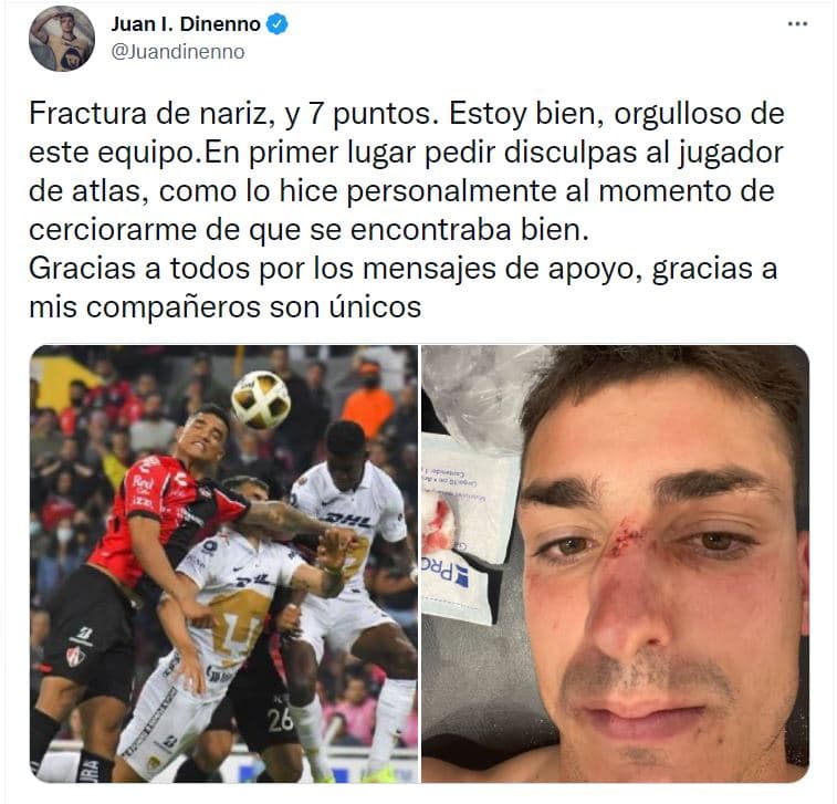 El jugador de Pumas, Juan Ignacio Dinenno mostró su molestia en redes sociales tras el encuentro ante Atlas que los dejó fuera de la Gran Final del Grita México BBVA A21.