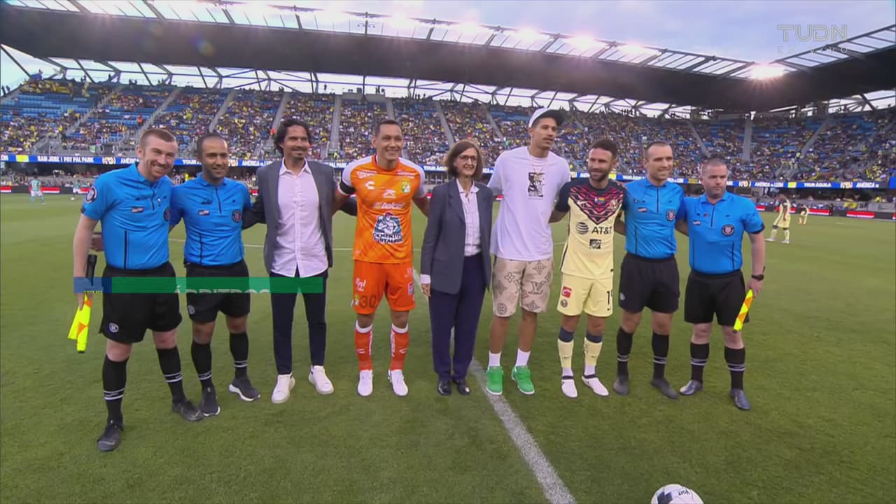 El mexicoestadounidense tuvo su participación especial al inicio del compromiso, acompañado de Braulio Luna y lanzó la moneda como es tradición en el futbol.