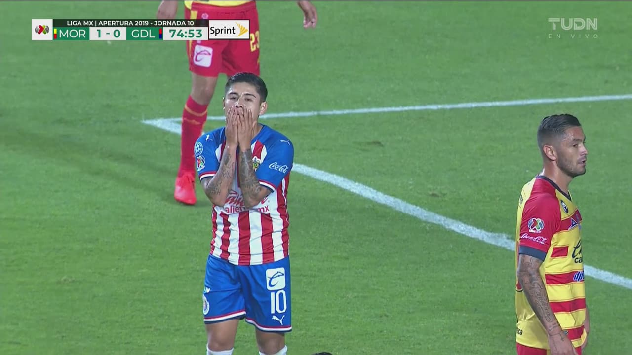 Javier recibe el balón, gira y deja atrás a dos jugadores del Morelia, y suelta un remate cruzado que de milagro no fue gol.