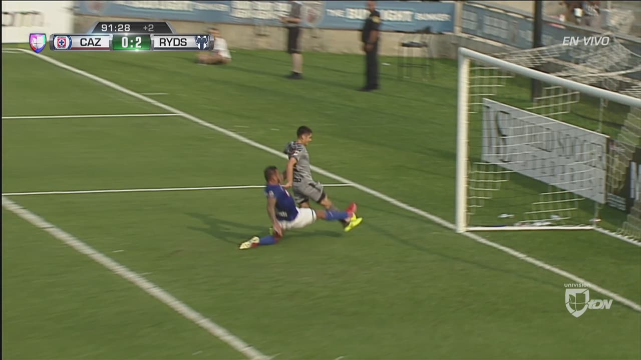El defensa argentino del Cruz Azul salvó la goleada en el tiempo de compensación llegando a última línea y atropellando a Alvarado del Monterrey que se llevó un buen golpe.