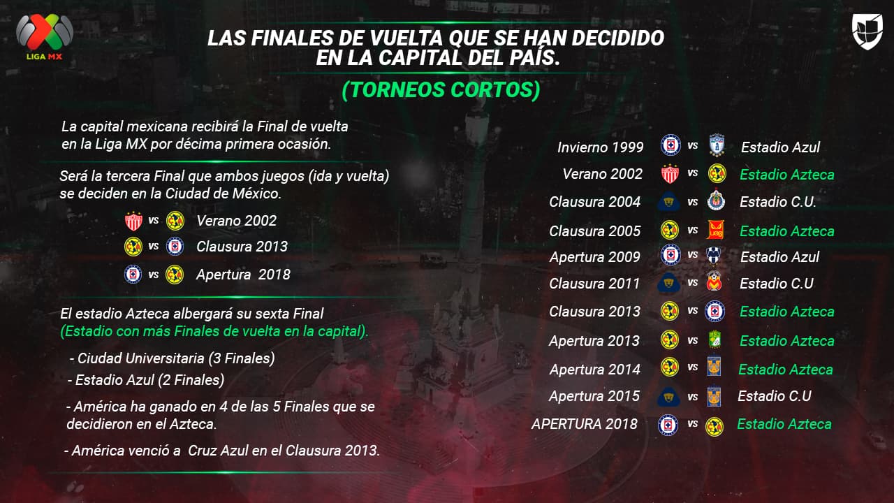 Con la Final entre Cruz Azul y América en el presente torneo Apertura 2018, la capital mexicana albergará por décima primera ocasión en el lapso de los 44 torneos cortos disputados, considerando el actual, el cotejo decisivo para conocer al campeón de la Liga MX.