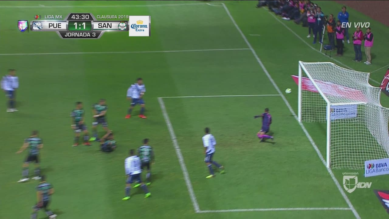 Poste del Puebla tras un disparo potentísimo desde las afueras del área.
