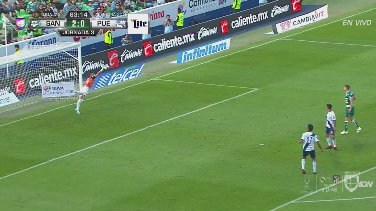 Ayrton Preciado debuta en el fútbol mexicano y prueba al arco pero el guardameta de los visitantes evita la anotación.