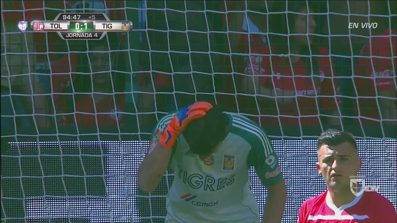 Cuando mejor jugaban los Diablos Rojos y el final del primer tiempo se acercaba, los de la UANL aplicaron su máxima cualidad, ir al contralpe, y con un potente riflazo de Luis Quiñones, exjugador de Toluca, el esférico entró al vertice inferior izquierdo para terminar fuera y así requerir una revisión del VAR que lo avalara.