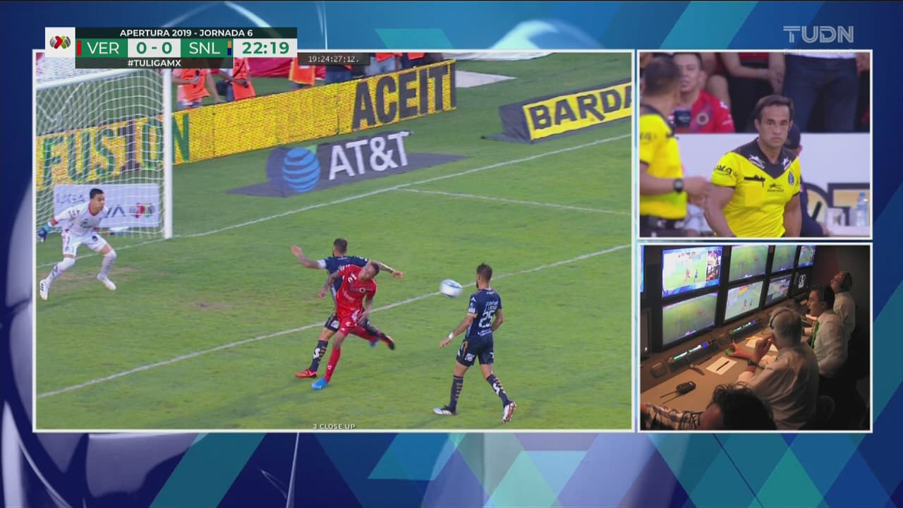 El árbitro recurre al VAR para marcar un penalti en favor del Veracruz, pero después revisa por segunda vez la jugada y quita el penalti a los Tiburones