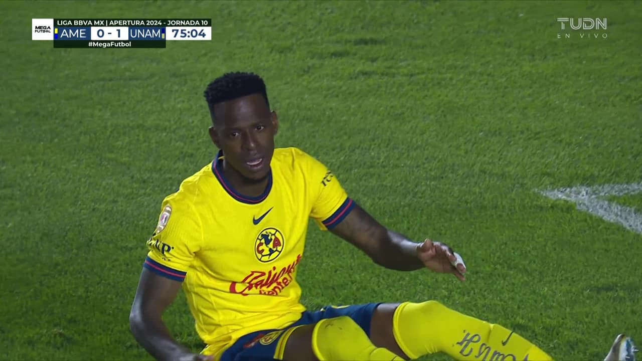 Kevin Álvarez se escapa por la banda derecha mete gran centro al área y el futbolista del América remata de cabeza directo a las manos de Julio González.