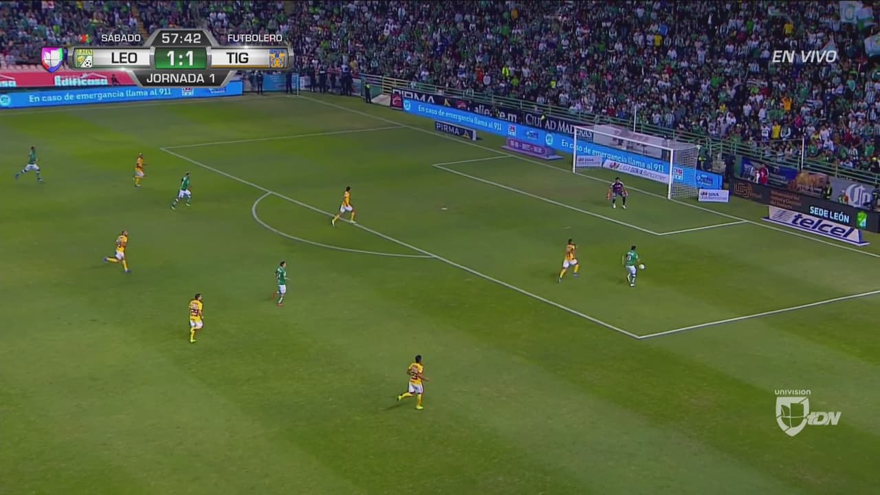 El refuerzo de la Fiera llega hasta la última línea esmeralda, pero al buscar el disparo cruzado terminó poniendo el esférico fuera del primer palo.