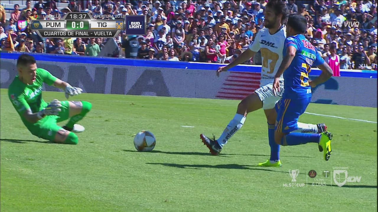 Tigres intenta por la banda izquierda y aprovecha un descuido para meterse en el área rival, pero Saldívar está atento.
