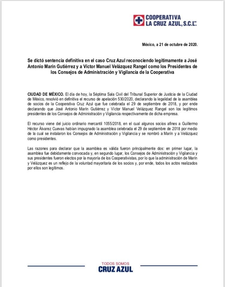 Este miércoles, la Cooperativa La Cruz Azul anunció, a través de un comunicado oficial, que José Antonio Marín tomó posesión como Presidente de los Consejos de Administración y Víctor Manuel Velázquez el de Vigilancia de la Cooperativa, tras la salida de Guillermo Álvarez Cuevas de la institución.