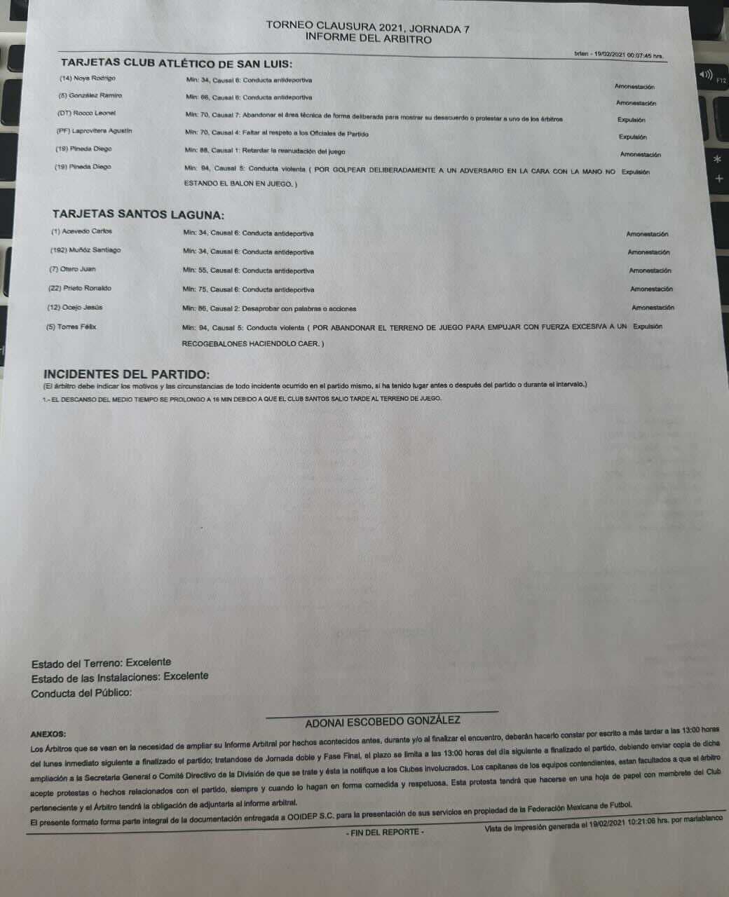 A pesar de esto, hay un hecho relevante en la investigación y se trata de la cédula arbitral. El silbante Adonai Escobedo no incluyó registro de ningún acto racista.