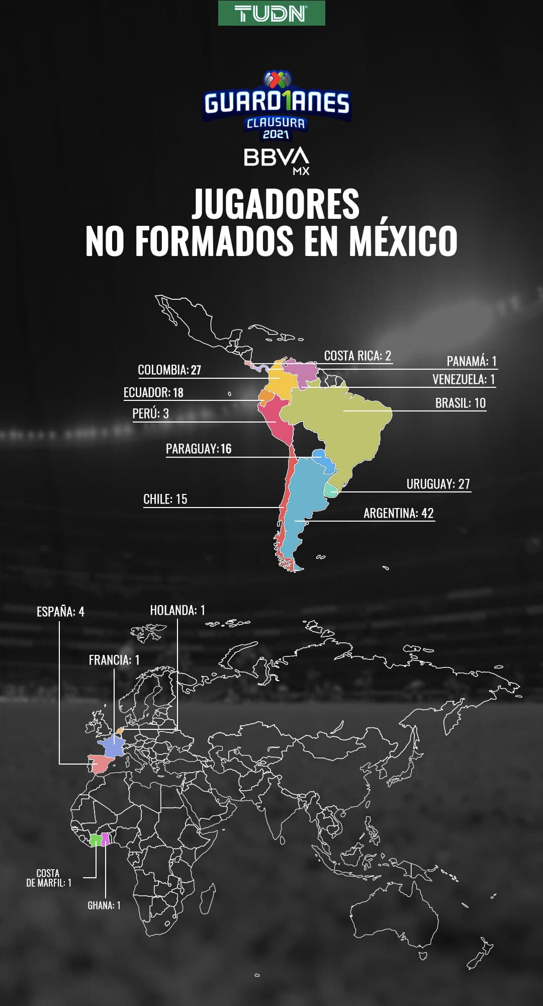 La Liga BBVA MX permite en su reglamento hasta 11 jugadores No Formados en México (NFM) hasta esta temporada de los cuales la mayoría son de Argentina, 42, pero también hay cinco elementos de Europa y hasta dos africanos; en total son 170.