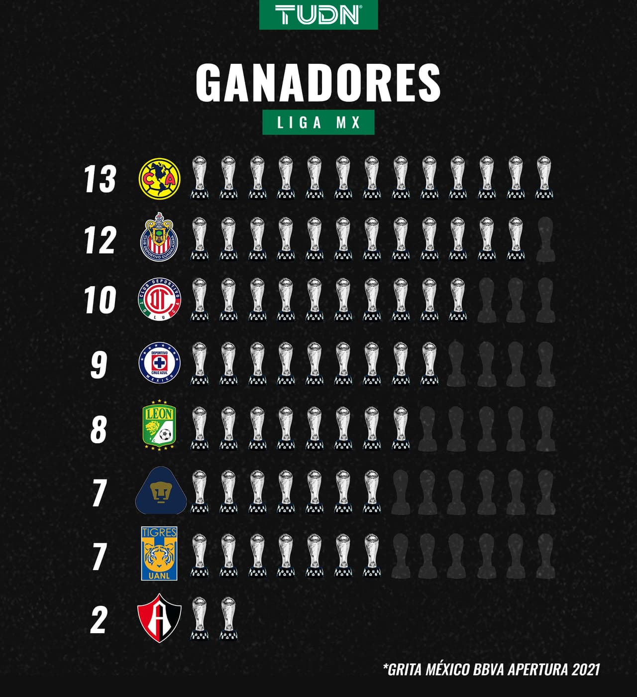 1968-69, México 1970, 1971-72, 1972-73, 1973-74, 1978-79, 1979-80, Invierno 1997 y Clausura 2021.