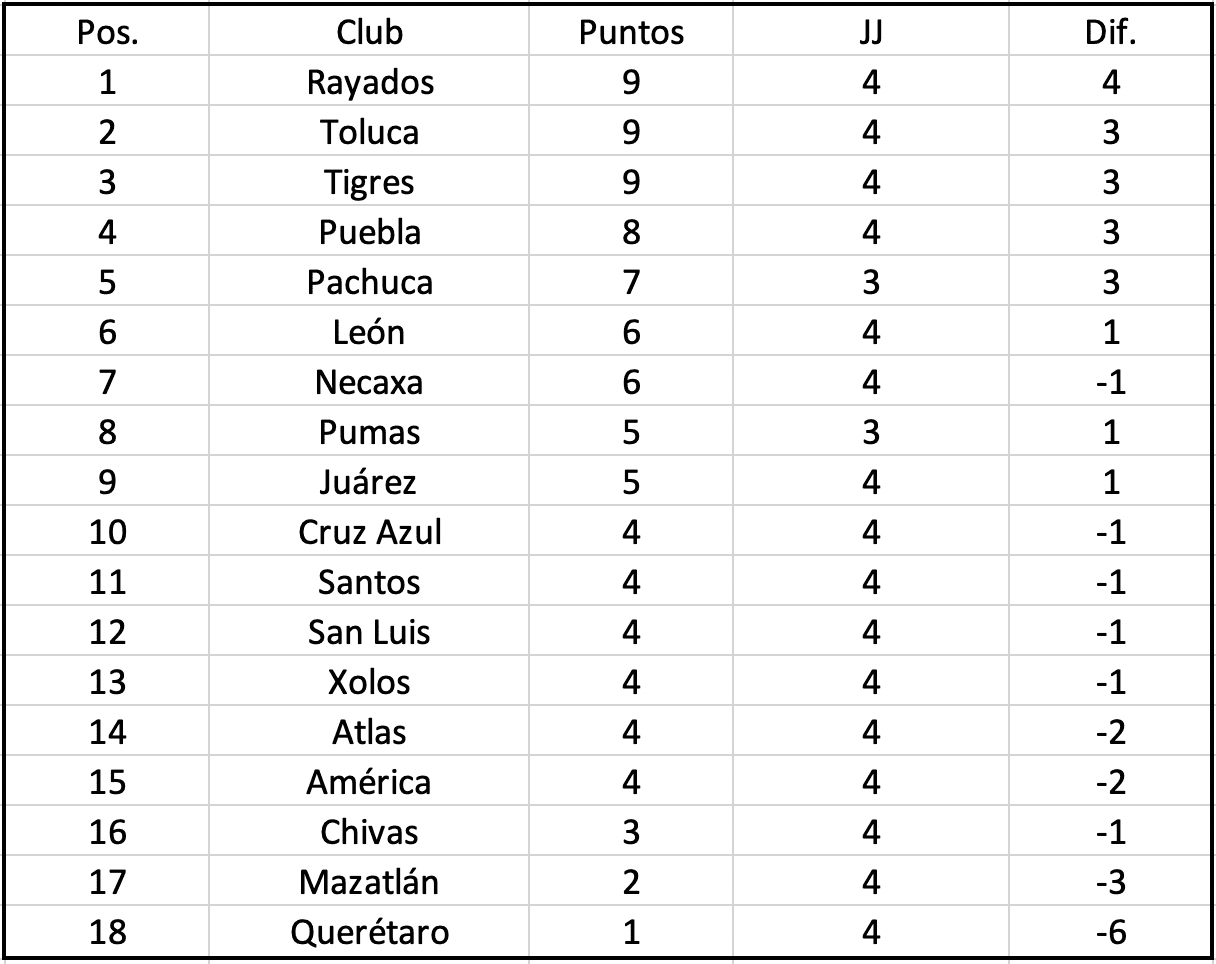 TABLA DE POSICIONES EN LA JORNADA 4 DE LA LIGA MX