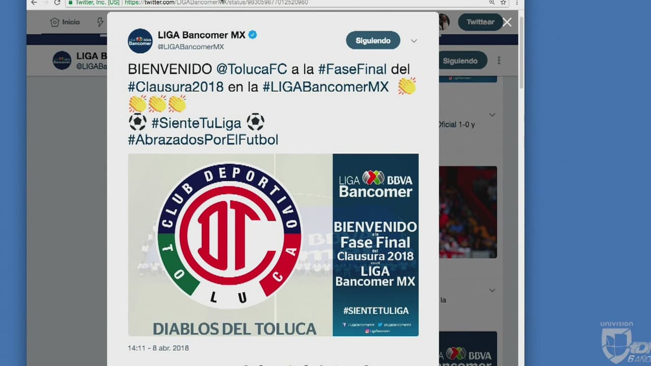 El Toluca, en primera posición con 30 puntos, y el club Santos Laguna de segundo con 29 están matemáticamente clasificados para la Liguilla del torneo Clausura 2018. Así lo celebró la liga en sus redes.