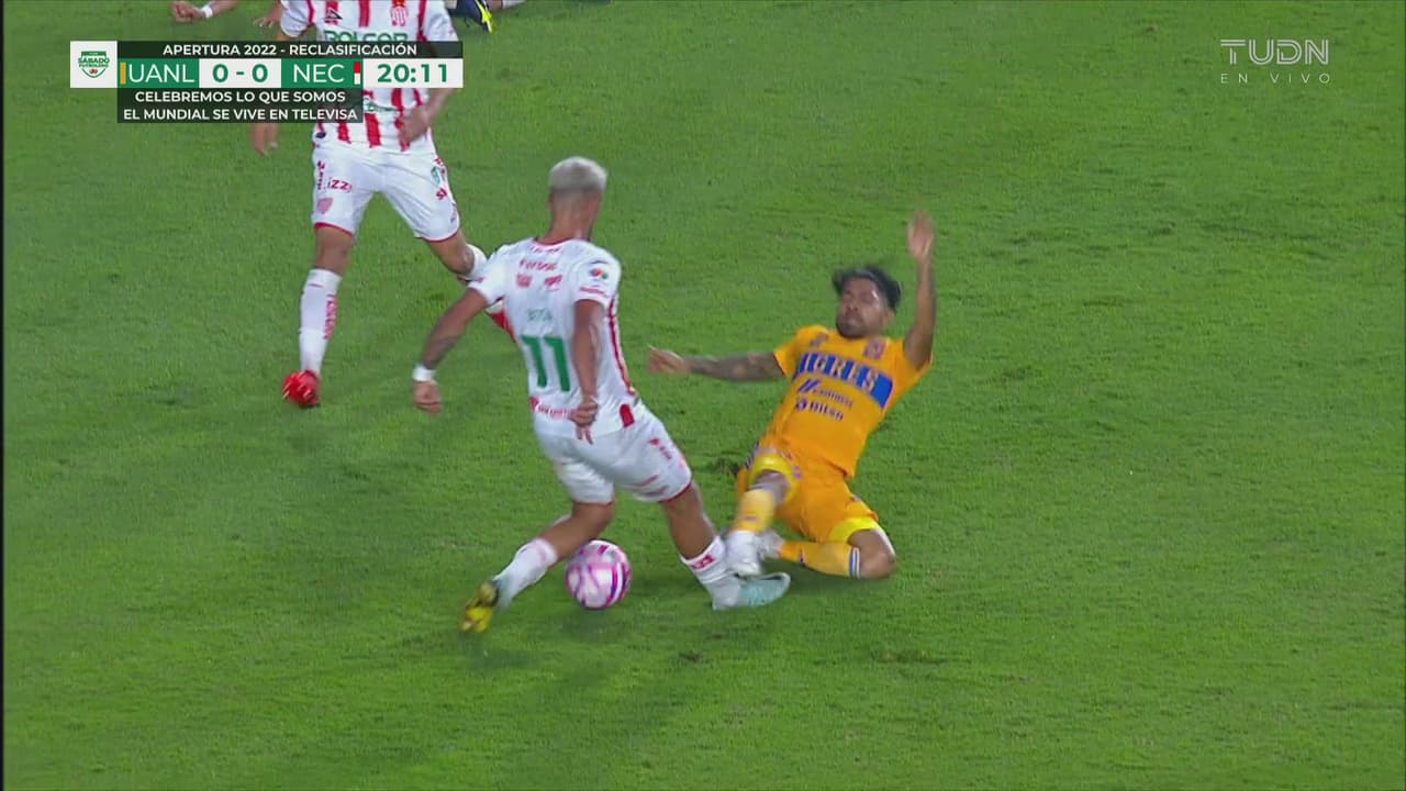 Tigres sufrió su primer revés en la Liguilla del Apertura 2022 a los 20 minutos de su partido único de Repechaje frente al Necaxa tras la expulsión de Javier Aquino por una barrida a destiempo en la que dejó los tachones por delante y dar una plancha sobre Facundo Batista.