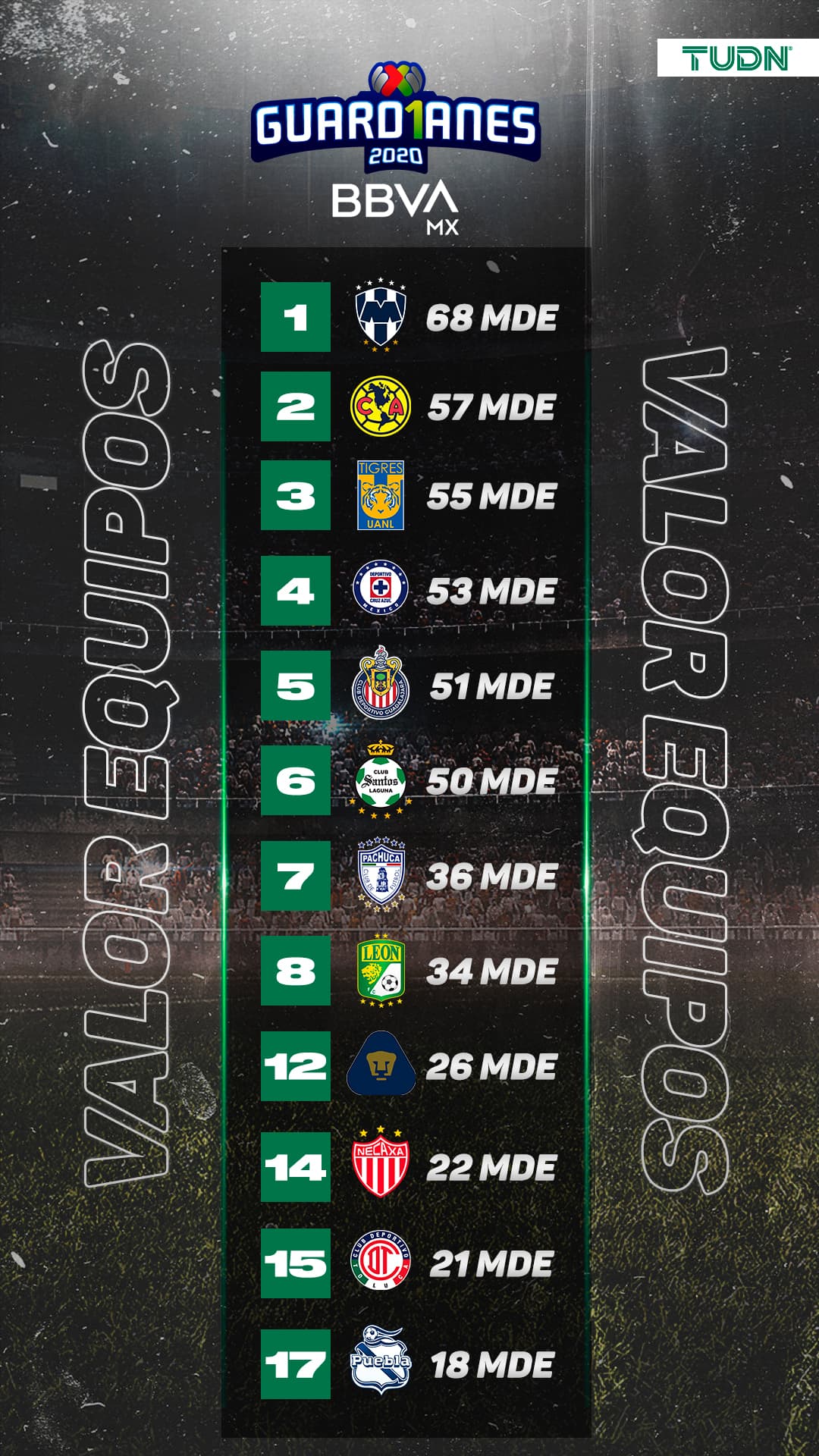 Asimismo, los Guerreros son el sexto club más caro, mientras los Tuzos están un lugar debajo, en la séptima posición. Sin embargo, la diferencia es considerable, pues el valor de los laguneros está por encima con diferencia de 14 millones de euros.