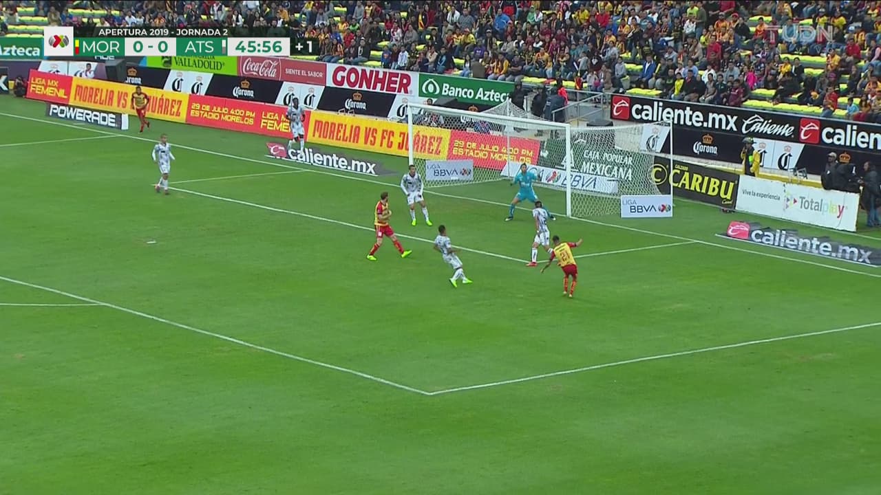 Centro pasado de Flores, 'el Quik' llegó justo a tiempo para rematar pero no le dio dirección a su balón.