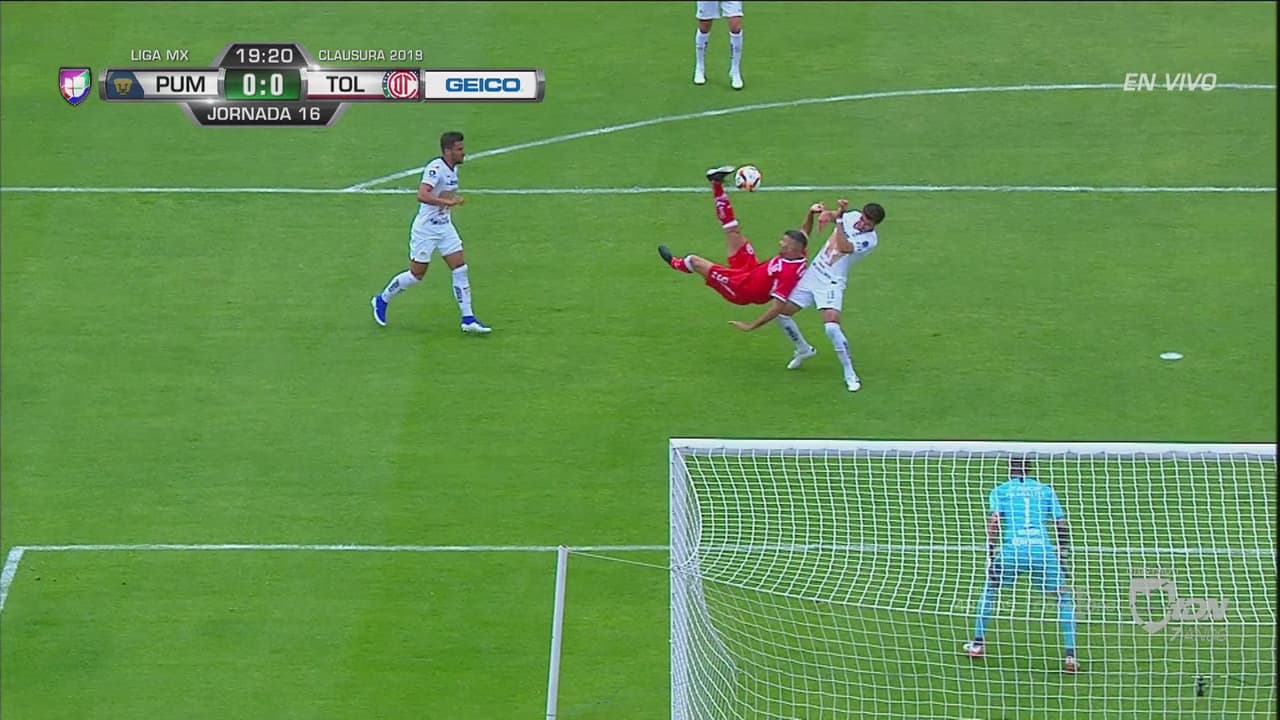 El delantero argentino de Toluca volvió a llevar peligro a la portería de Pumas, esta vez con una cabriola en el aire que encontró bien parado al portero de los locales.