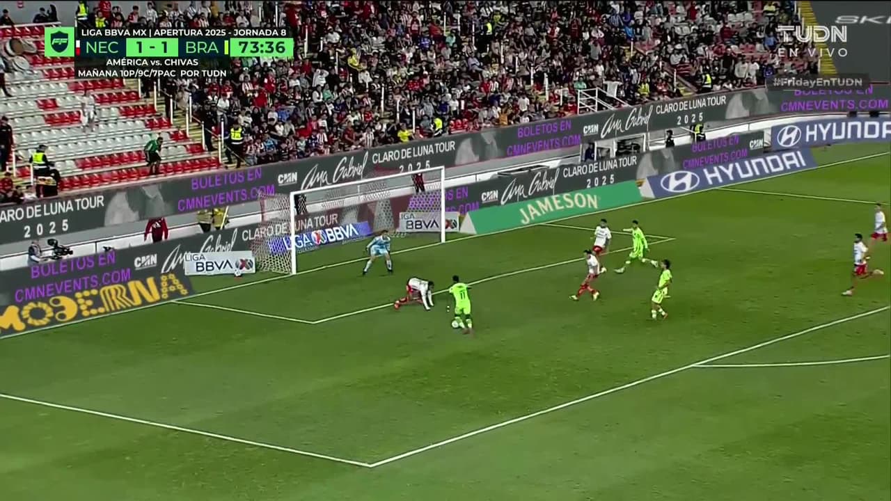 El ‘Puma’ Rodríguez quedó de frente al gol, pero el arquero de Necaxa achicó con gran reflejo y le negó el segundo a Bravos. ¡Figura clave!