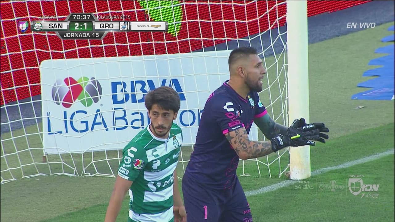 El balón iba hacia adentro pero el arquero alcanzó a quitarle dirección a la pelota.