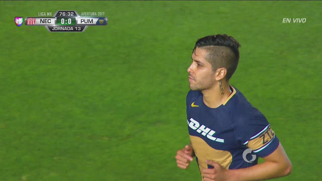 El mediocampista de los Pumas buscó poner el balón pegado al poste, pero el portero de Necaxa se estiró para alejar el balón de su arco.