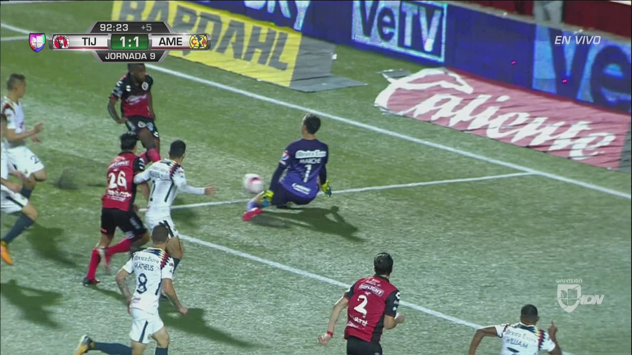Fenomenal el portero argentino del América que, al minuto 92, le detiene el remate a quemarropa al delantero ecuatoriano del Tijuana, Miller Bolaños.