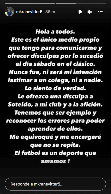 “Le ofrezco una disculpa a Soteldo, a mi club y a la afición. Tenemos que ser ejemplo y reconocer los errores para poder aprender de ellos. Me equivoqué y me encargaré que no se repita. El futbol es un deporte que amamos”, escribió Kranevitter desde su cuenta personal de Instagram.