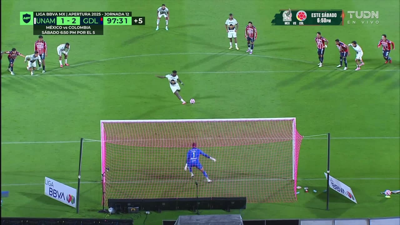 El lateral universitario no puede con la presión y estrella el balón en el poste y lo pierde Pumas.