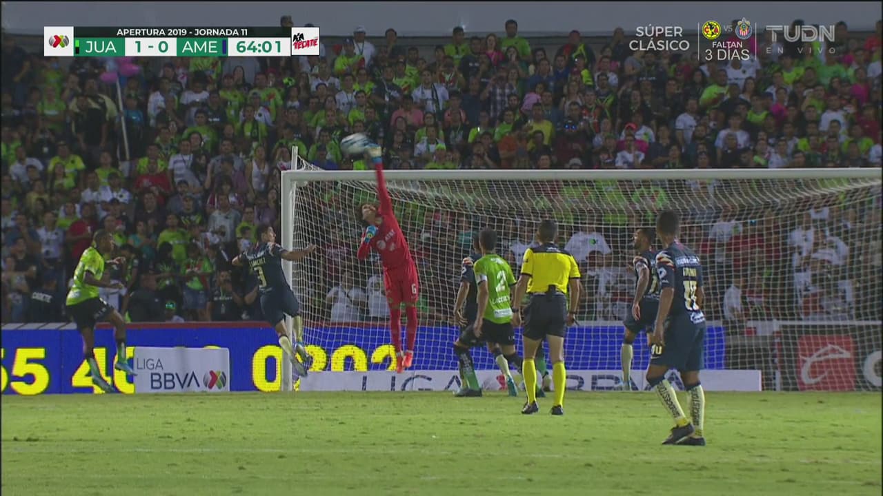 Centro largo al área, el arquero del América no atina a manotear y el uruguayo falla al 64’.