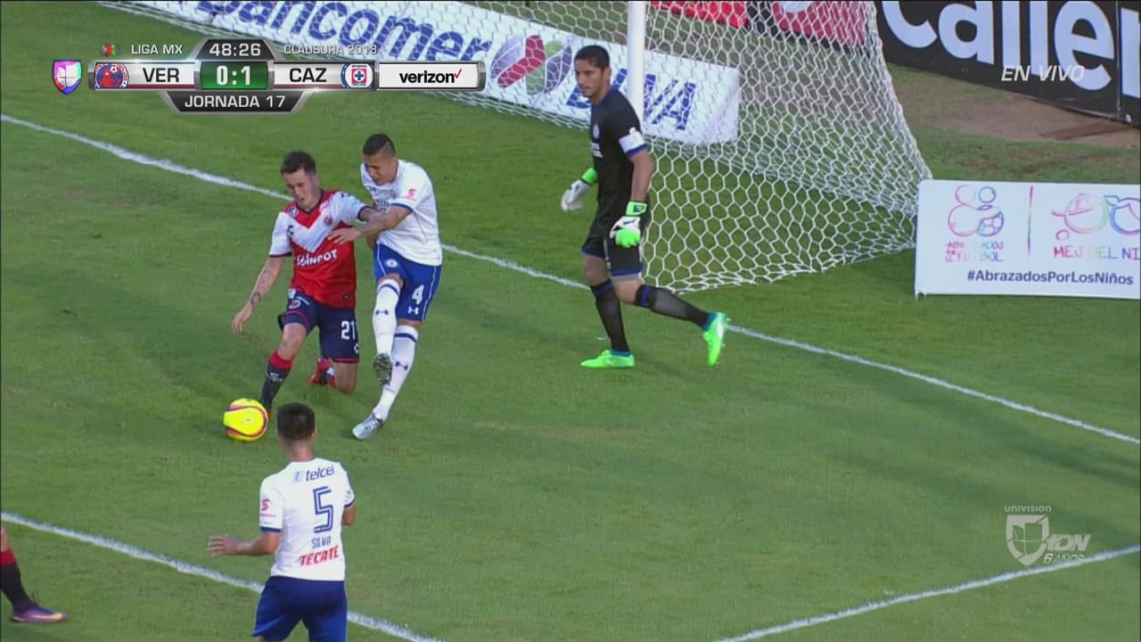 El delantero argentino del Veracruz se hizo una ocasión en el área celeste que parecía acabaría en gol hasta que Adrián Luna se tiró una barrida imprudente que lo pintó de amarillo.