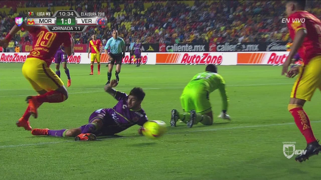 Tras verse abajo por dos goles en el marcador el conjunto de Veracruz se lanzó al frente y al minuto 38 casi logran la anotación, pero Carlos Rodríguez les robó la alegría con una barrida en la línea para evitar la caída de su marco y Monarcas se fue al descanso con el 2-0.