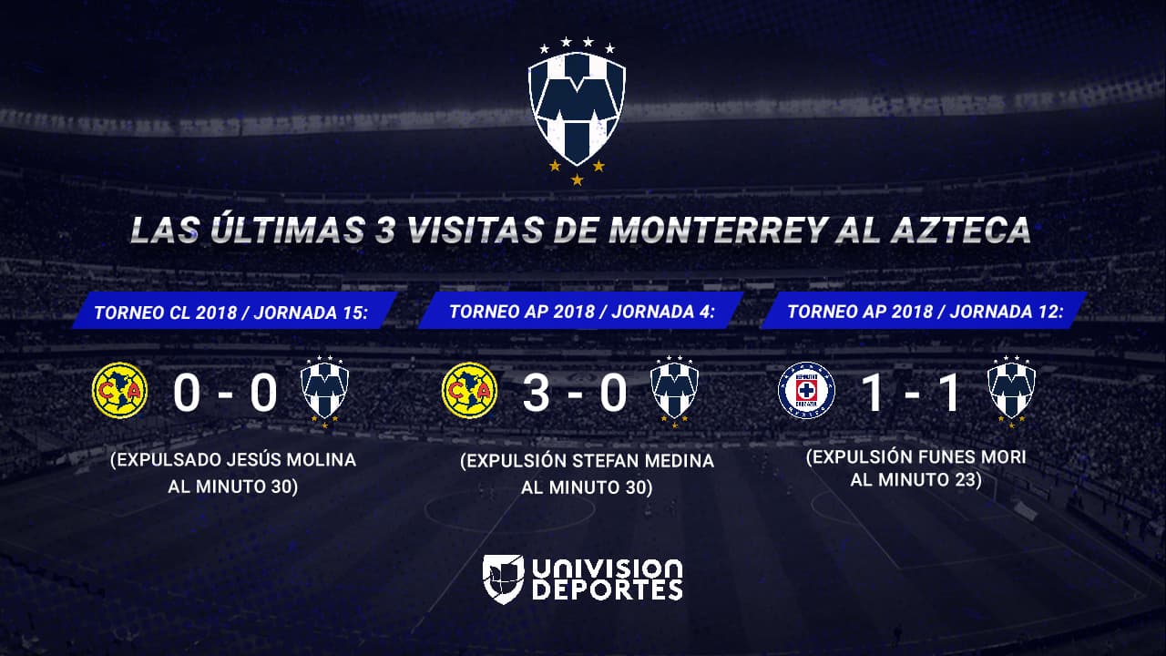 Por historia, jugar en el estadio Azteca es complicado y, en especial, Rayados de Monterrey suele dificultar sus visitas a este inmueble ya que en sus últimas tres visitas de Liga MX no ha terminado los encuentros con 11 futbolistas en el campo y en dichos cotejos solo ha sumado un punto de nueve disputados. El equipo norteño se ha enfrentado dos ocasiones ante América y una ante Cruz Azul durante los últimos seis meses